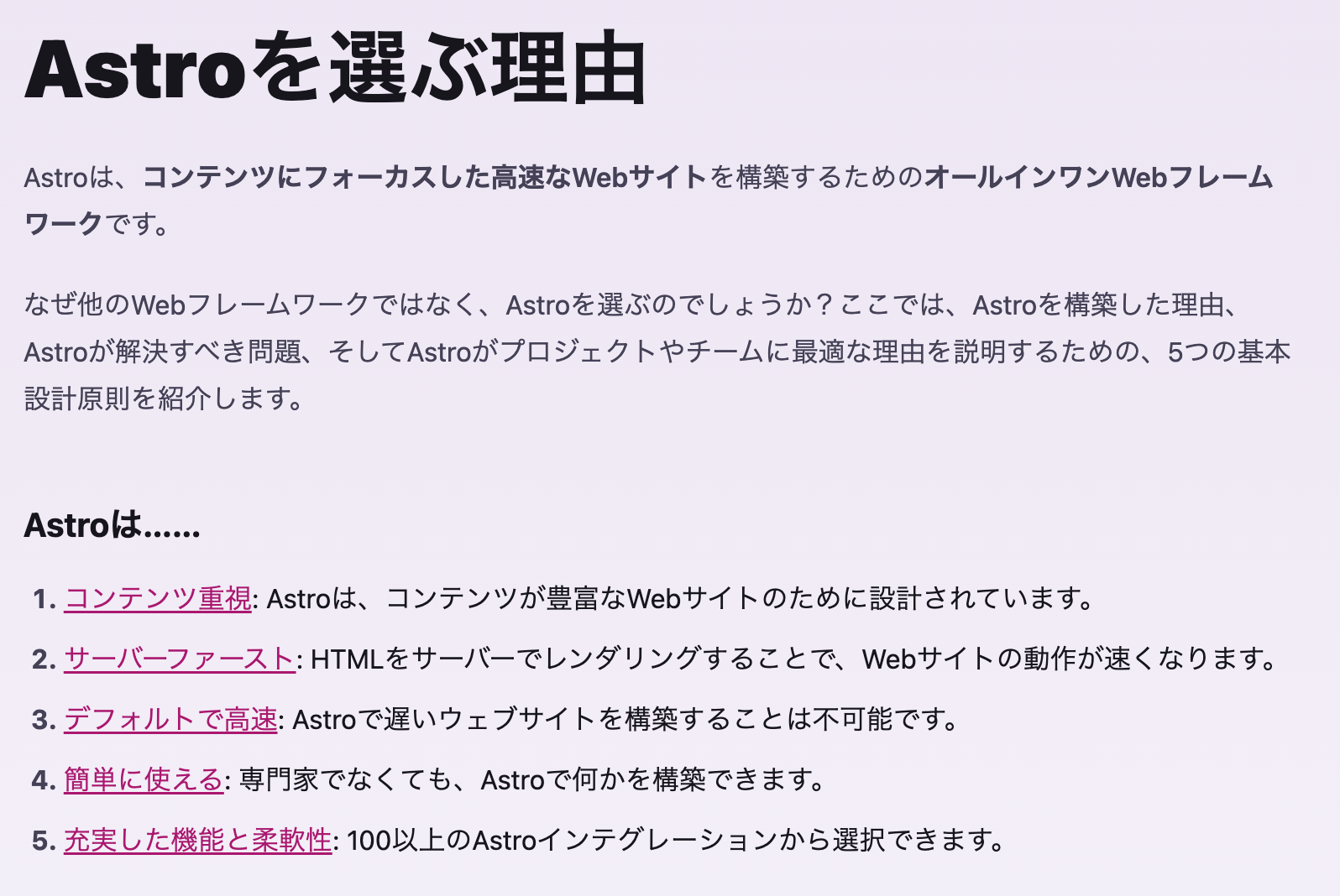 公式の Astro を選ぶ理由を読むとブログ作るならこれでいいかーという気持ちになったのと、実際にブログを作るためのチュートリアルがしっかりありこのブログもデザイン以外の部分はほぼこのチュートリアルを進めただけの内容になっています。タグの実装とか本当にコピペ。